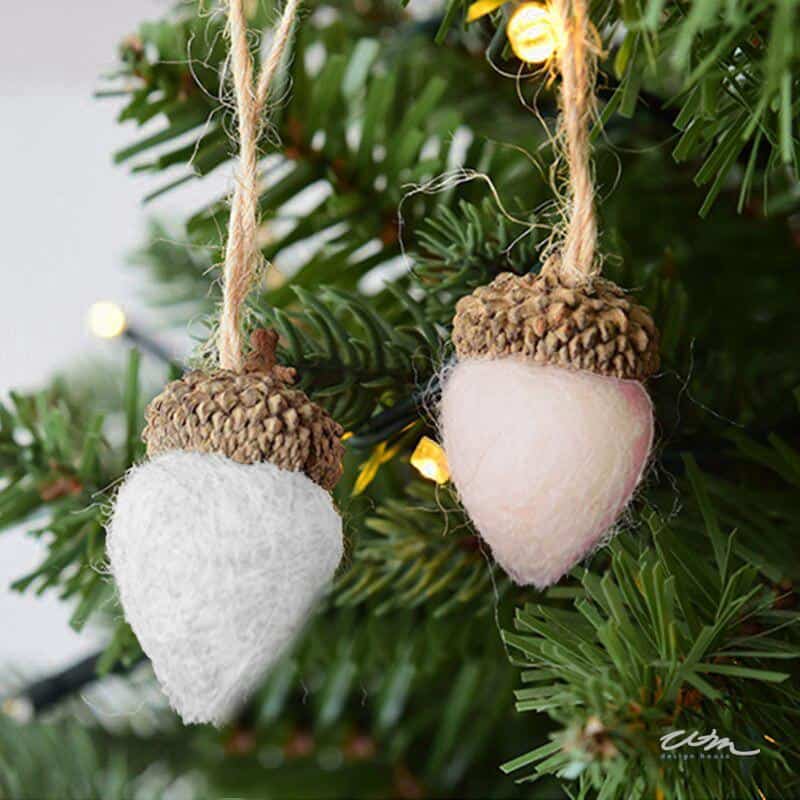 - – Glue a pom-pom, a wooden ball, or a felted ball into each acorn cap to finish each acorn ornament.